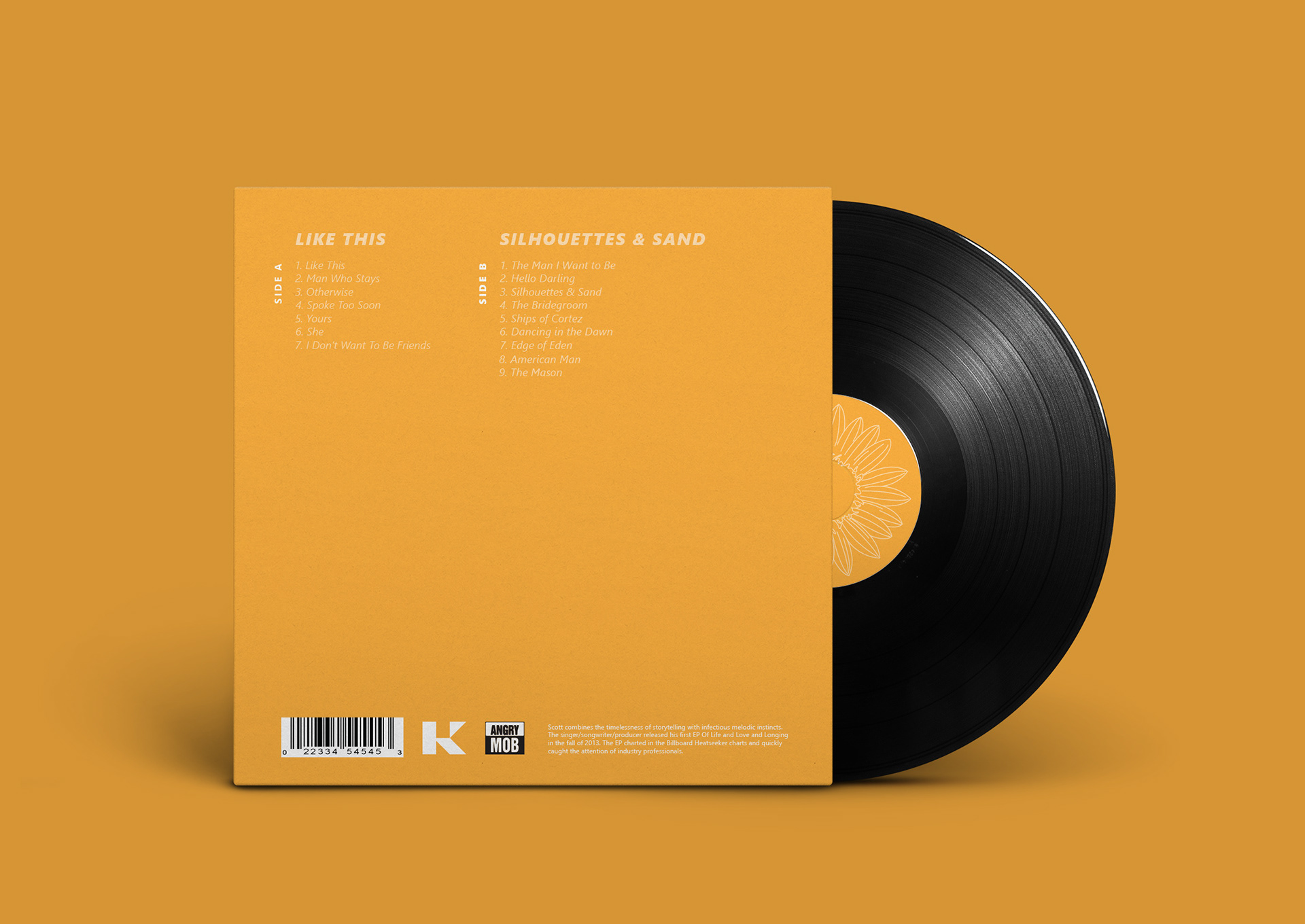 A vinyl record design for Jake Scott album "Like This" including "Silhouettes & Sand." The design approach was to create a modern collage with images, illustration, and geometric shapes.